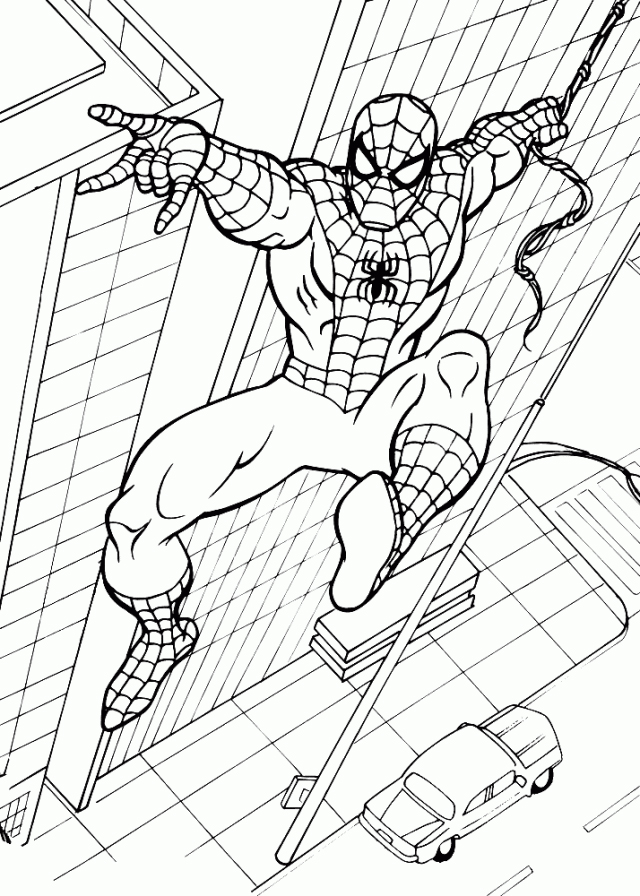 Découvrez ce superbe coloriage de Spiderman spider man lance une toile dans new york à imprimer.