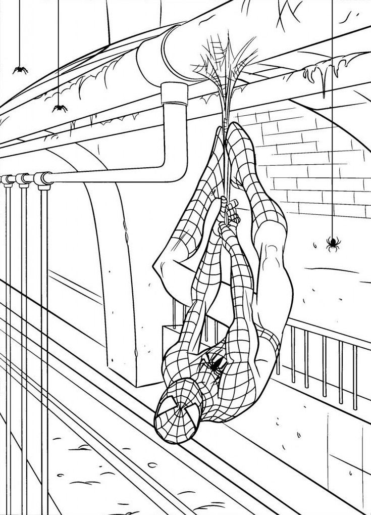 Découvrez ce superbe coloriage de Spiderman spider man suspendu a lenvers à imprimer.